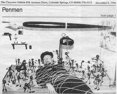 Gary Blehm, creator of PENMEN, hard at work on his drawing table in 1996. The comic strip had just begun running nationally by Creators Syndicate. The posable PENMEN were hand made to give away to newspapers. The image published in Editor and Publisher magazine.